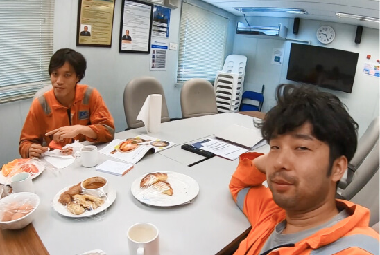 食事は多国籍・多文化を考慮したメニューが用意されており、操業国によってはイスラム教徒用のハラールフードを用意する場合もあります。